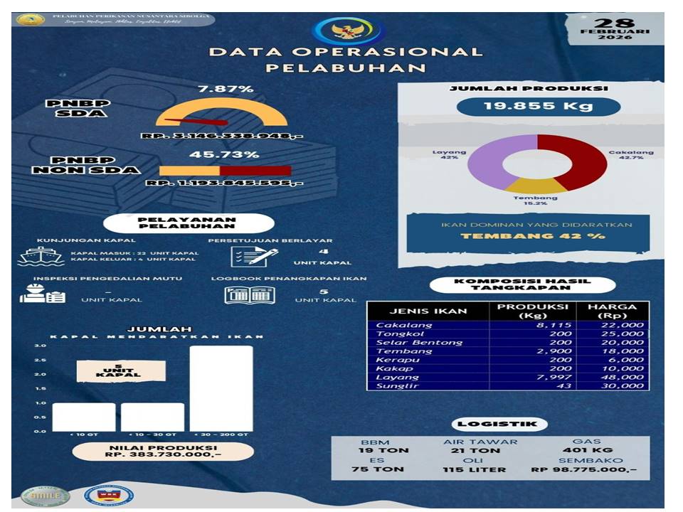 Sobat Bahari,,,Yuk kita simak Infografis Data Operasional Harian PPN Sibolga, 28 Februari 2026 antara lain : Jumlah Unit Kapal, Jumlah Produksi, Nilai Produksi, PNBP SDA, PNBP Non SDA, Pelayanan Pelabuhan