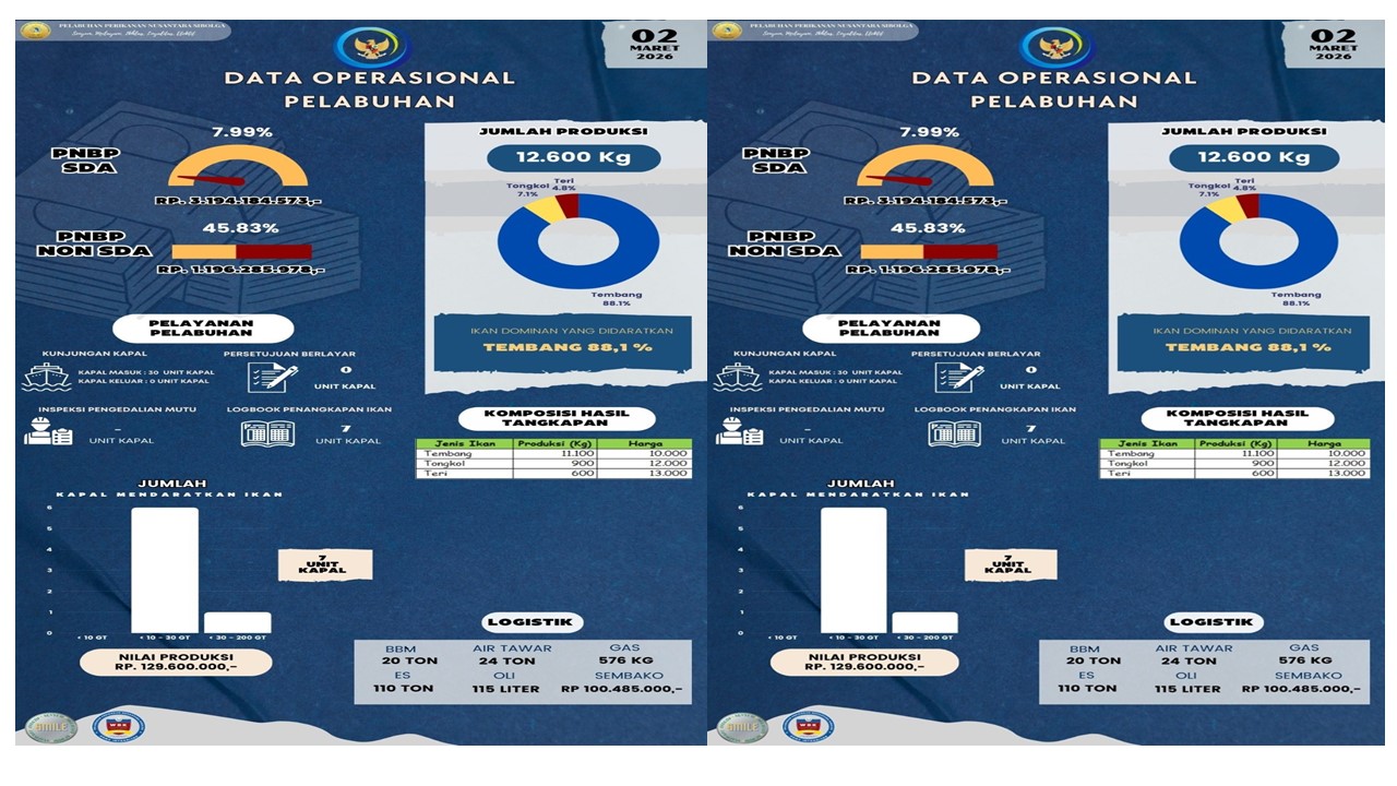 Sobat Bahari,,,Yuk kita simak Infografis Data Operasional Harian PPN Sibolga, 02 Maret 2026 antara lain : Jumlah Unit Kapal, Jumlah Produksi, Nilai Produksi, PNBP SDA, PNBP Non SDA, Pelayanan Pelabuhan