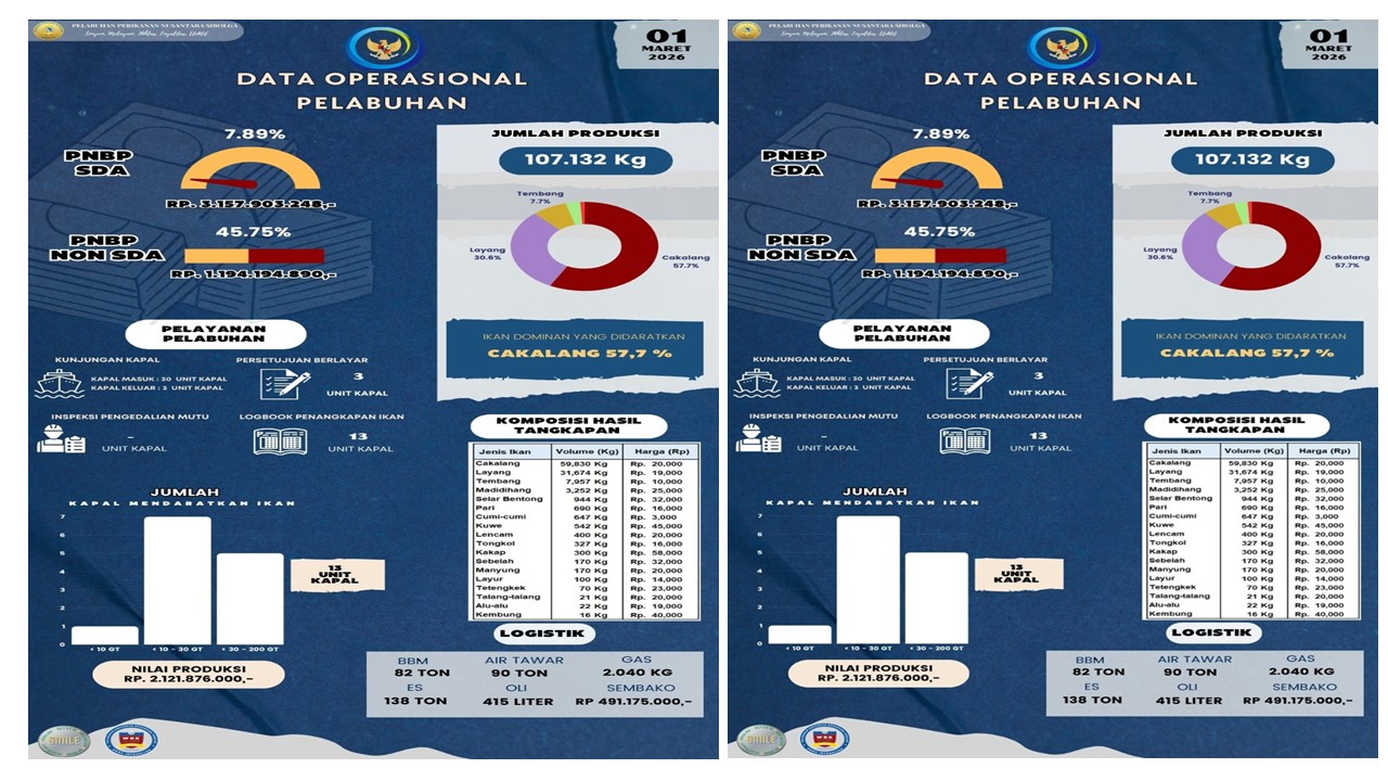 Sobat Bahari,,,Yuk kita simak Infografis Data Operasional Harian PPN Sibolga, 01 Maret 2026 antara lain : Jumlah Unit Kapal, Jumlah Produksi, Nilai Produksi, PNBP SDA, PNBP Non SDA, Pelayanan Pelabuhan