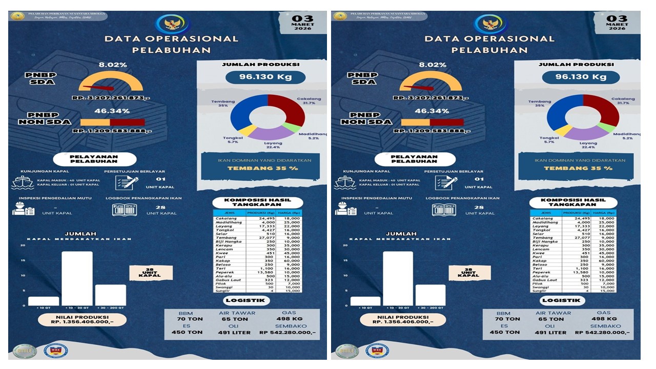 Sobat Bahari,,,Yuk kita simak Infografis Data Operasional Harian PPN Sibolga, 03 Maret 2026 antara lain : Jumlah Unit Kapal, Jumlah Produksi, Nilai Produksi, PNBP SDA, PNBP Non SDA, Pelayanan Pelabuhan