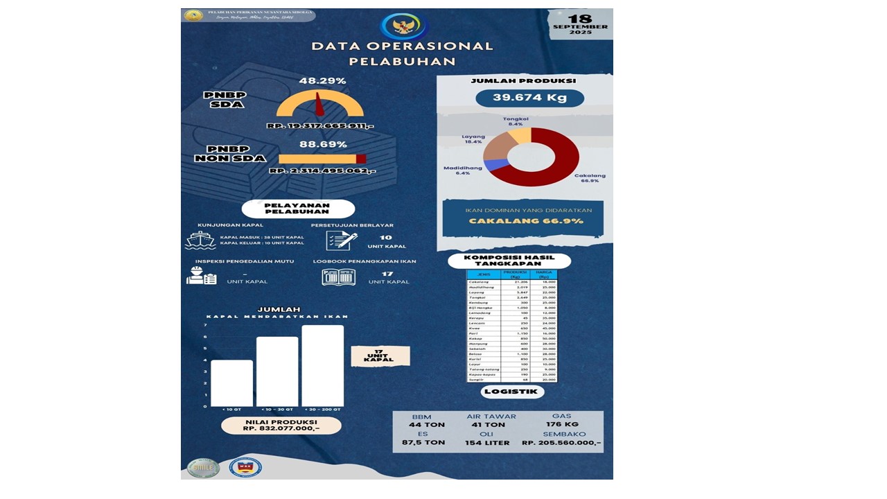 Sobat Bahari,,,Yuk kita simak Infografis Data Operasional Harian PPN Sibolga, 18 September 2025 antara lain : Jumlah Unit Kapal, Jumlah Produksi, Nilai Produksi, PNBP SDA, PNBP Non SDA, Pelayanan Pelabuhan;
