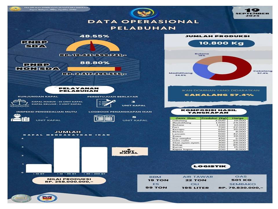 Sobat Bahari,,,Yuk kita simak Infografis Data Operasional Harian PPN Sibolga, 19 September 2025 antara lain : Jumlah Unit Kapal, Jumlah Produksi, Nilai Produksi, PNBP SDA, PNBP Non SDA, Pelayanan Pelabuhan;