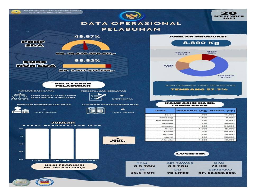 Sobat Bahari,,,Yuk kita simak Infografis Data Operasional Harian PPN Sibolga, 20 September 2025 antara lain : Jumlah Unit Kapal, Jumlah Produksi, Nilai Produksi, PNBP SDA, PNBP Non SDA, Pelayanan Pelabuhan;