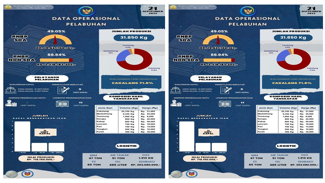 Sobat Bahari,,,Yuk kita simak Infografis Data Operasional Harian PPN Sibolga, 21 September 2025 antara lain : Jumlah Unit Kapal, Jumlah Produksi, Nilai Produksi, PNBP SDA, PNBP Non SDA, Pelayanan Pelabuhan;