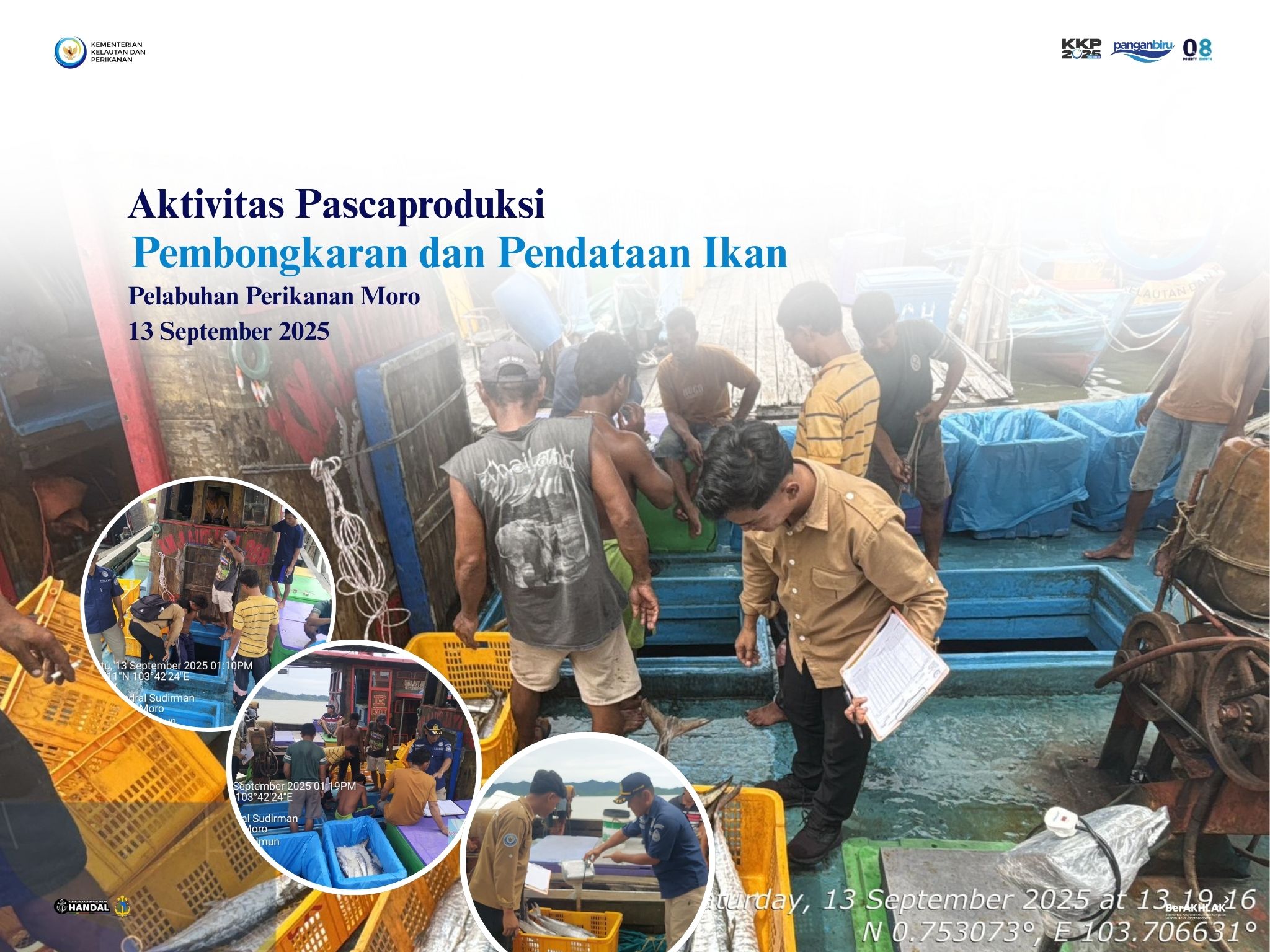 Sabtu (13 September 2025), Petugas PP. Moro melakukan aktivitas pembongkaran dan pendataan ikan Kapal Pasca Produksi dalam rangka mendukung program PIT pada kapal penangkap ikan dengan alat tangkap Jaring Insang Hanyut di Pelabuhan Perikanan Moro