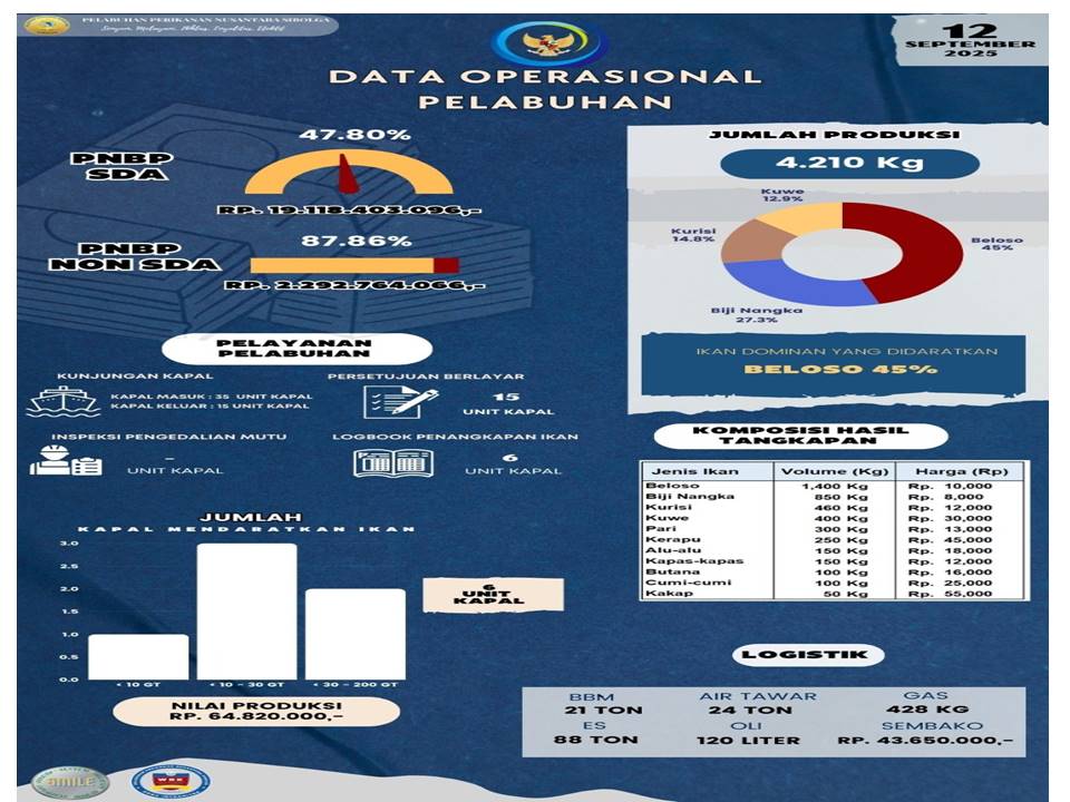 Sobat Bahari,,,Yuk kita simak Infografis Data Operasional Harian PPN Sibolga, 12 September 2025 antara lain : Jumlah Unit Kapal, Jumlah Produksi, Nilai Produksi, PNBP SDA, PNBP Non SDA, Pelayanan