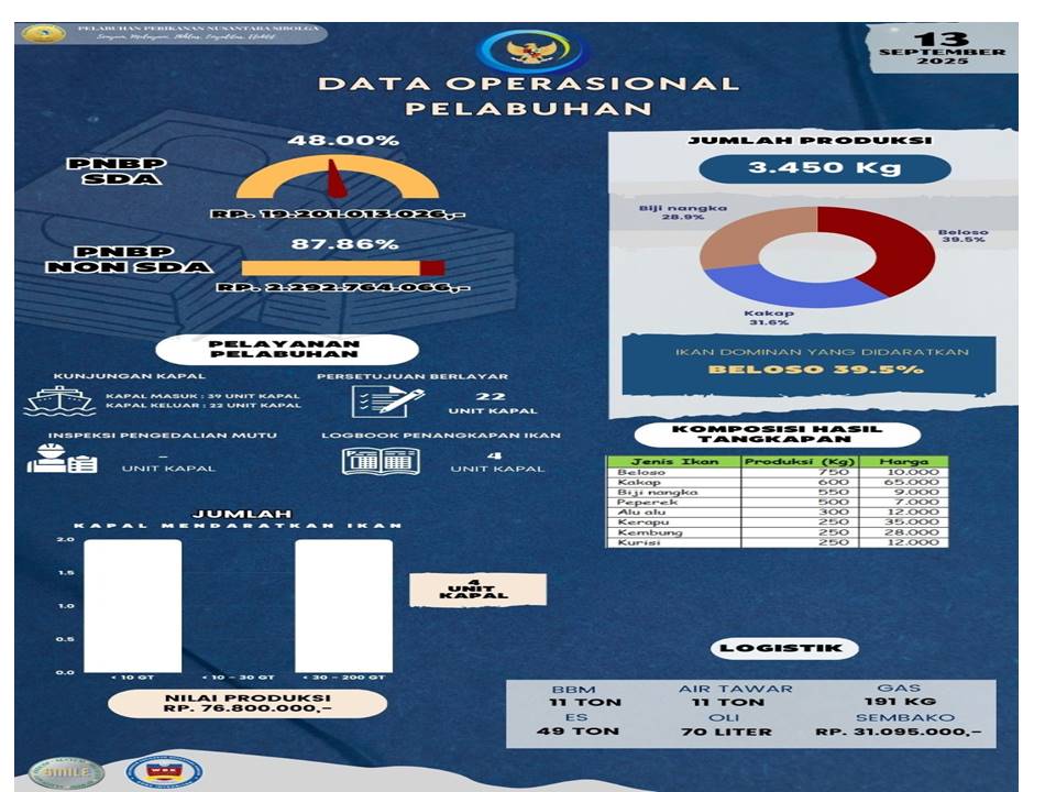 Sobat Bahari,,,Yuk kita simak Infografis Data Operasional Harian PPN Sibolga, 13 September 2025 antara lain : Jumlah Unit Kapal, Jumlah Produksi, Nilai Produksi, PNBP SDA, PNBP Non SDA, Pelayanan