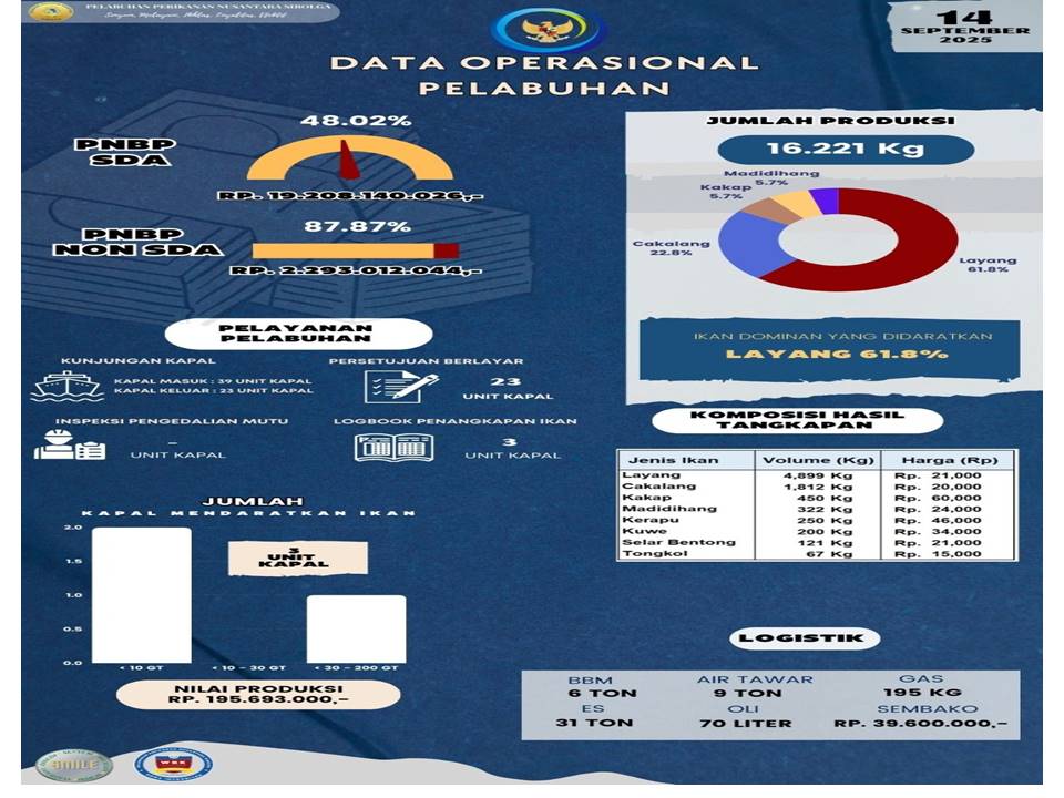 Sobat Bahari,,,Yuk kita simak Infografis Data Operasional Harian PPN Sibolga, 14 September 2025 antara lain : Jumlah Unit Kapal, Jumlah Produksi, Nilai Produksi, PNBP SDA, PNBP Non SDA, Pelayanan