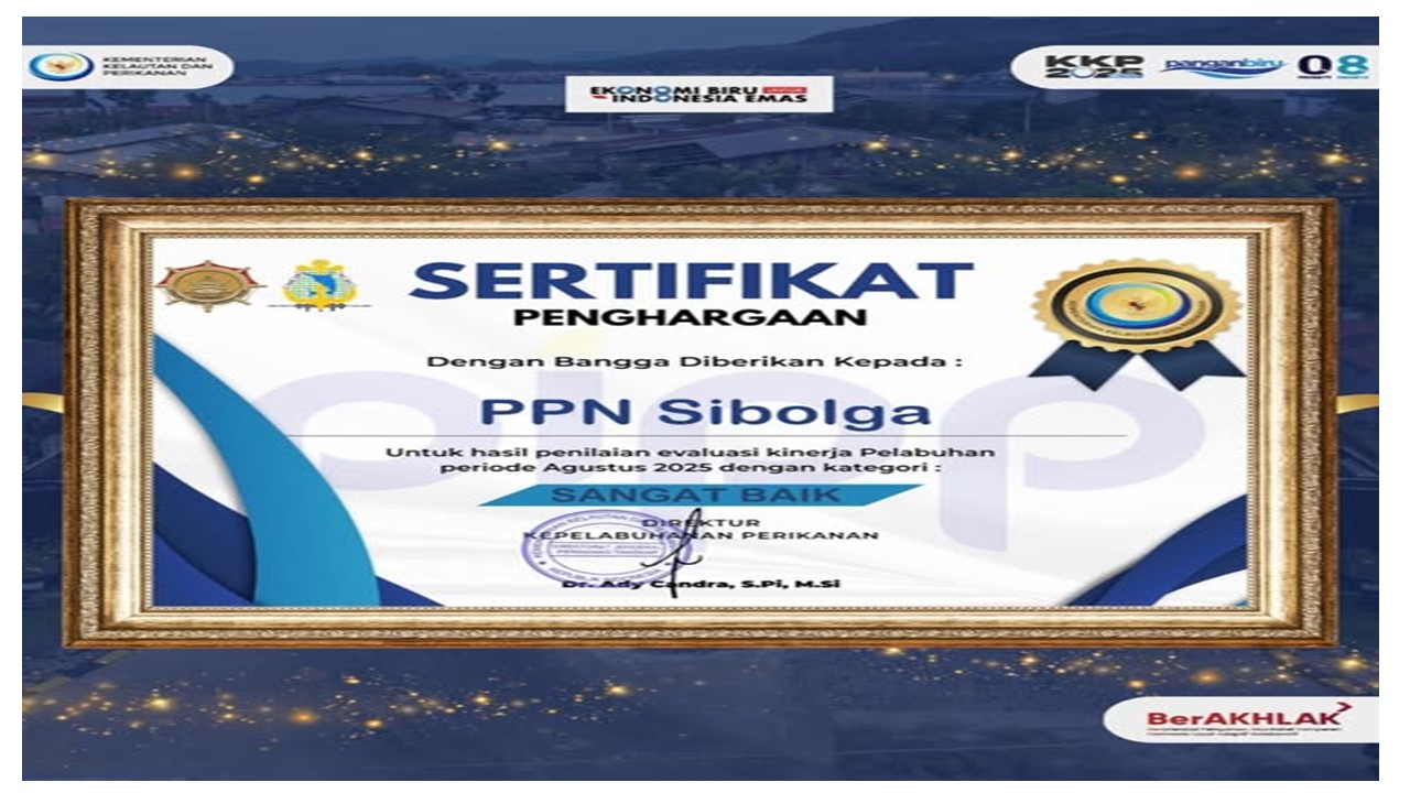 PPN Sibolga mendapatkan penghargaan atas Hasil Evaluasi Kinerja Operasional Pelabuhan Perikanan Periode Agustus 2025, dengan kategori “Sangat Baik”.