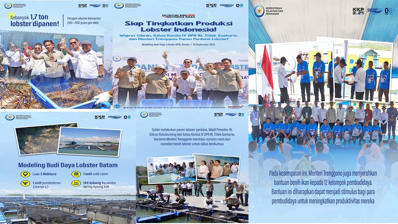#SahabatBahari, hari ini Wakil Presiden RI @gibran_rakabuming, Ketua Komisi IV DPR RI @titieksoeharto, dan Menteri Trenggono @swtrenggono melakukan panen perdana lobster di BPBL Batam dengan total panen mencapai 1.7 ton!