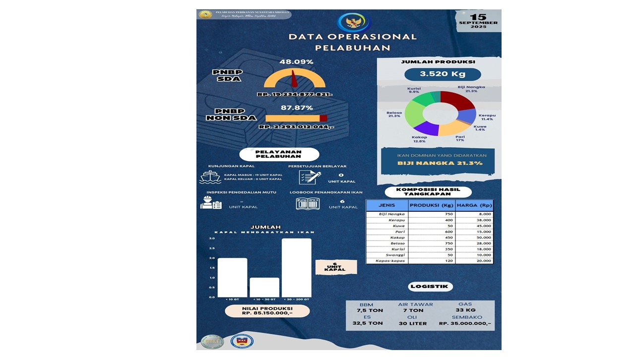 Sobat Bahari,,,Yuk kita simak Infografis Data Operasional Harian PPN Sibolga, 15 September 2025 antara lain : Jumlah Unit Kapal, Jumlah Produksi, Nilai Produksi, PNBP SDA, PNBP Non SDA, Pelayanan