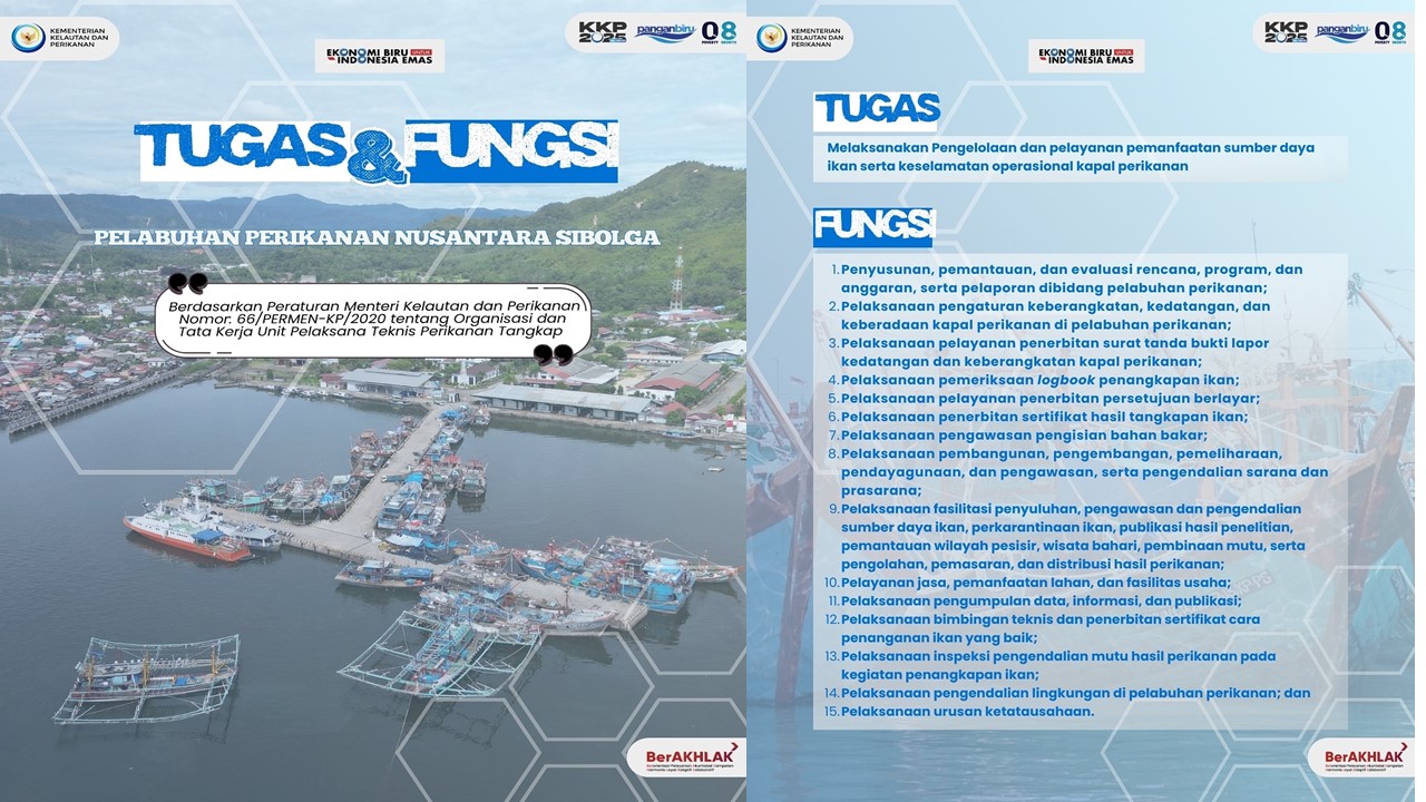 Senin, 15 September 2025. Merujuk Permen KP No 66 Tahun 2020, tentang Organisasi dan Tata Kerja Unit Pelaksana Teknis Perikanan Tangkap, PPN Sibolga memiliki tugas dan fungsi dalam mendukung pengelolaan perikanan tangkap. Untuk informasi selengkapnya ...