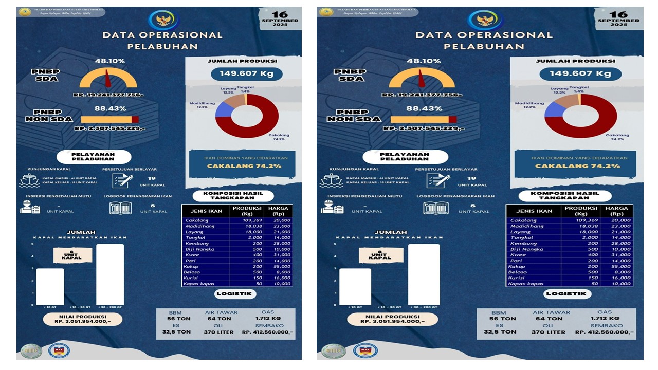 Sobat Bahari,,,Yuk kita simak Infografis Data Operasional Harian PPN Sibolga, 16 September 2025 antara lain : Jumlah Unit Kapal, Jumlah Produksi, Nilai Produksi, PNBP SDA, PNBP Non SDA, Pelayanan