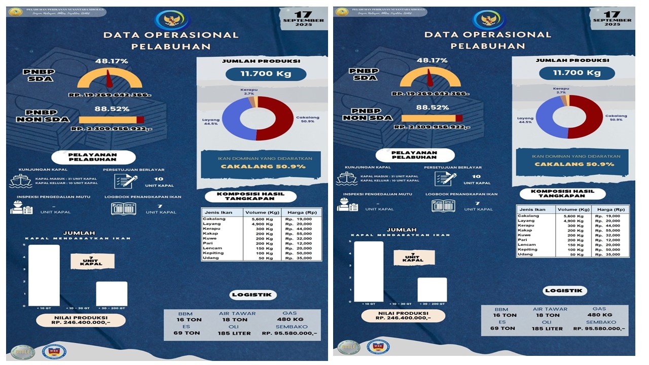 Sobat Bahari,,,Yuk kita simak Infografis Data Operasional Harian PPN Sibolga, 17 September 2025 antara lain : Jumlah Unit Kapal, Jumlah Produksi, Nilai Produksi, PNBP SDA, PNBP Non SDA, Pelayanan