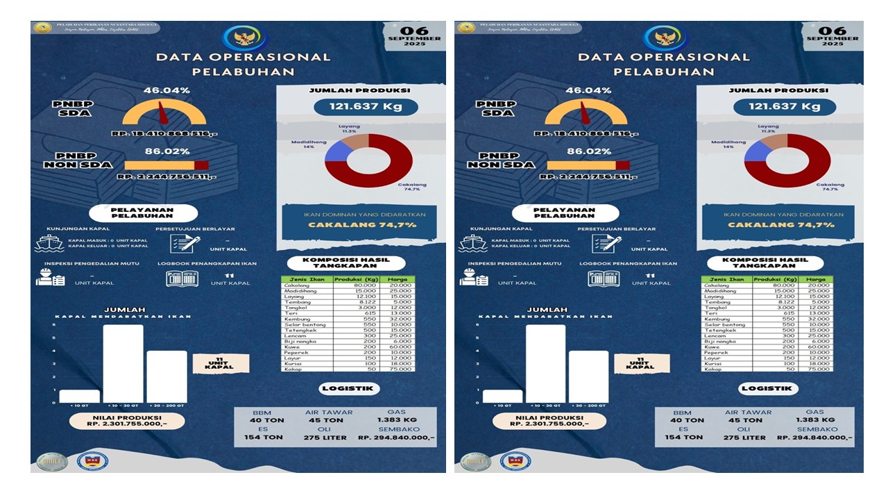 Sobat Bahari,,,Yuk kita simak Infografis Data Operasional Harian PPN Sibolga, 06 September 2025 antara lain : Jumlah Unit Kapal, Jumlah Produksi, Nilai Produksi, PNBP SDA, PNBP Non SDA, Pelayanan Pelabuhan dan Logistik