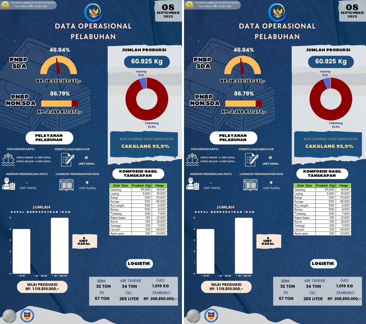 Sobat Bahari,,,Yuk kita simak Infografis Data Operasional Harian PPN Sibolga, 08 September 2025 antara lain : Jumlah Unit Kapal, Jumlah Produksi, Nilai Produksi, PNBP SDA, PNBP Non SDA, Pelayanan…