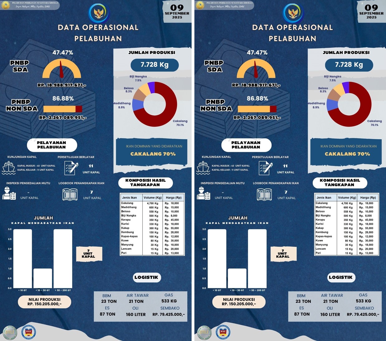 Sobat Bahari,,,Yuk kita simak Infografis Data Operasional Harian PPN Sibolga, 09 September 2025 antara lain : Jumlah Unit Kapal, Jumlah Produksi, Nilai Produksi, PNBP SDA, PNBP Non SDA, Pelayanan……