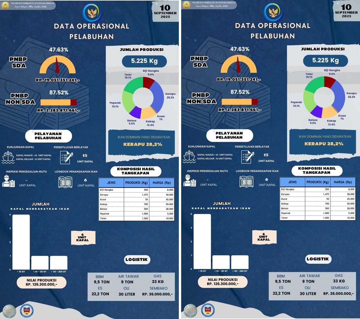 Sobat Bahari,,,Yuk kita simak Infografis Data Operasional Harian PPN Sibolga, 10 September 2025 antara lain : Jumlah Unit Kapal, Jumlah Produksi, Nilai Produksi, PNBP SDA, PNBP Non SDA, Pelayanan……