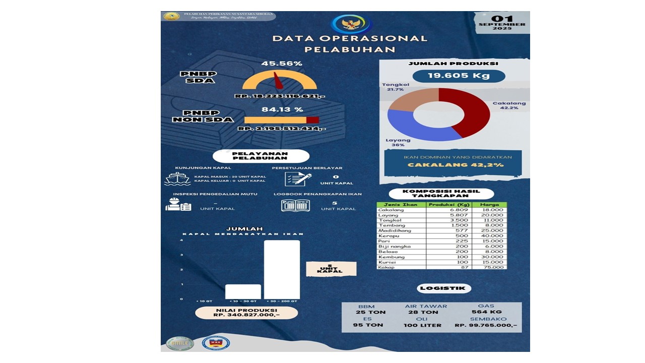 Sobat Bahari,,,Yuk kita simak Infografis Data Operasional Harian PPN Sibolga, 01 September 2025 antara lain : Jumlah Unit Kapal, Jumlah Produksi, Nilai Produksi, PNBP SDA, PNBP Non SDA, Pelayanan Pelabuhan dan Logistik