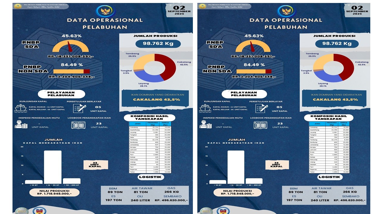 Sobat Bahari,,,Yuk kita simak Infografis Data Operasional Harian PPN Sibolga, 02 September 2025 antara lain : Jumlah Unit Kapal, Jumlah Produksi, Nilai Produksi, PNBP SDA, PNBP Non SDA, Pelayanan Pelabuhan dan Logistik