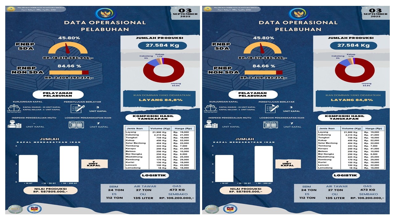 Sobat Bahari,,,Yuk kita simak Infografis Data Operasional Harian PPN Sibolga, 03 September 2025 antara lain : Jumlah Unit Kapal, Jumlah Produksi, Nilai Produksi, PNBP SDA, PNBP Non SDA, Pelayanan Pelabuhan dan Logistik