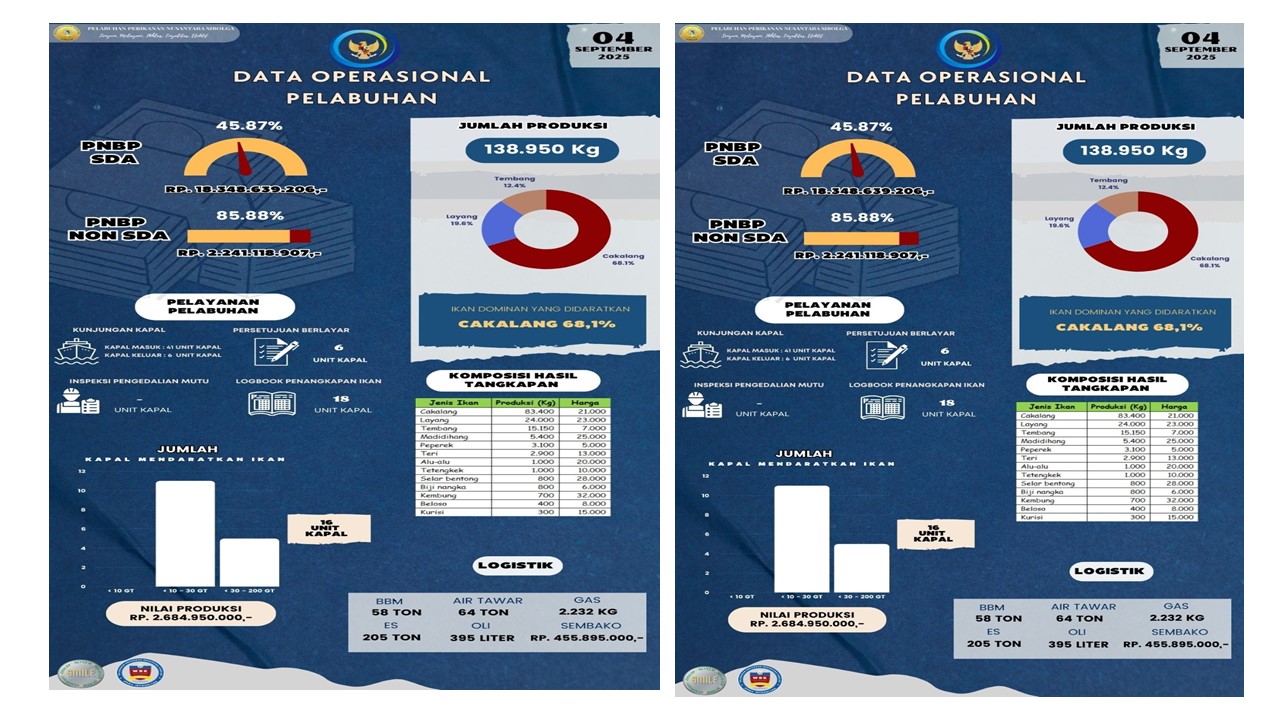 Sobat Bahari,,,Yuk kita simak Infografis Data Operasional Harian PPN Sibolga, 04 September 2025 antara lain : Jumlah Unit Kapal, Jumlah Produksi, Nilai Produksi, PNBP SDA, PNBP Non SDA, Pelayanan Pelabuhan dan Logistik