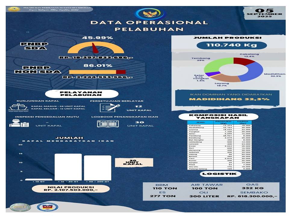 Sobat Bahari,,,Yuk kita simak Infografis Data Operasional Harian PPN Sibolga, 05 September 2025 antara lain : Jumlah Unit Kapal, Jumlah Produksi, Nilai Produksi, PNBP SDA, PNBP Non SDA, Pelayanan Pelabuhan dan Logistik
