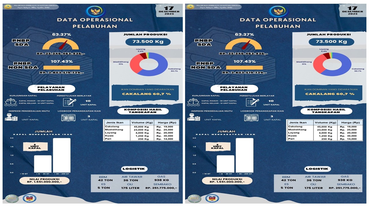 Sobat Bahari,,,Yuk kita simak Infografis Data Operasional Harian PPN Sibolga, 17 Desember 2025 antara lain : Jumlah Unit Kapal, Jumlah Produksi, Nilai Produksi, PNBP SDA, PNBP Non SDA, Pelayanan Pelabuhan