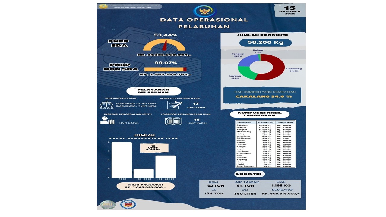 Sobat Bahari,,,Yuk kita simak Infografis Data Operasional Harian PPN Sibolga, 15 Oktober 2025 antara lain : Jumlah Unit Kapal, Jumlah Produksi, Nilai Produksi, PNBP SDA, PNBP Non SDA, Pelayanan Pelabuhan