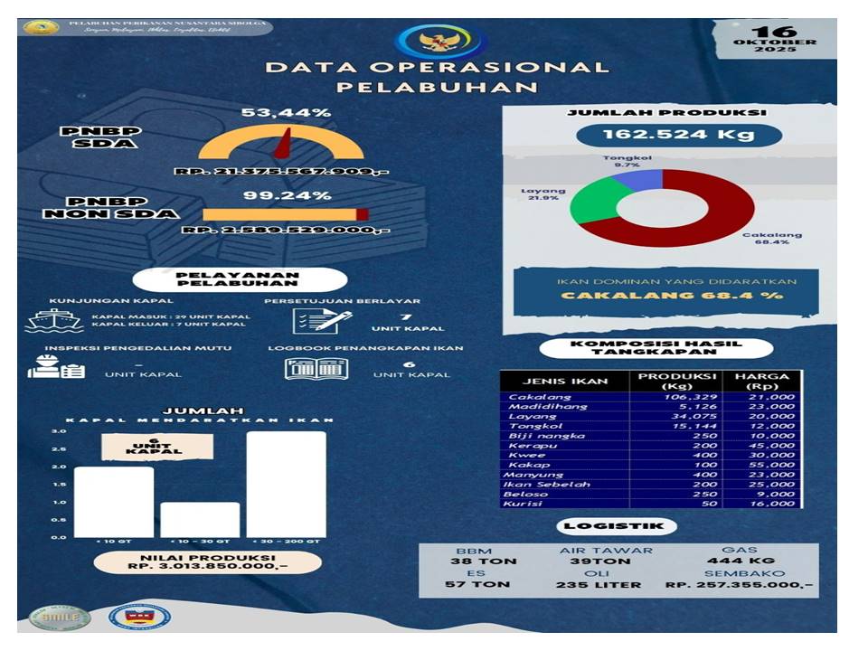 Sobat Bahari,,,Yuk kita simak Infografis Data Operasional Harian PPN Sibolga, 16 Oktober 2025 antara lain : Jumlah Unit Kapal, Jumlah Produksi, Nilai Produksi, PNBP SDA, PNBP Non SDA, Pelayanan Pelabuhan