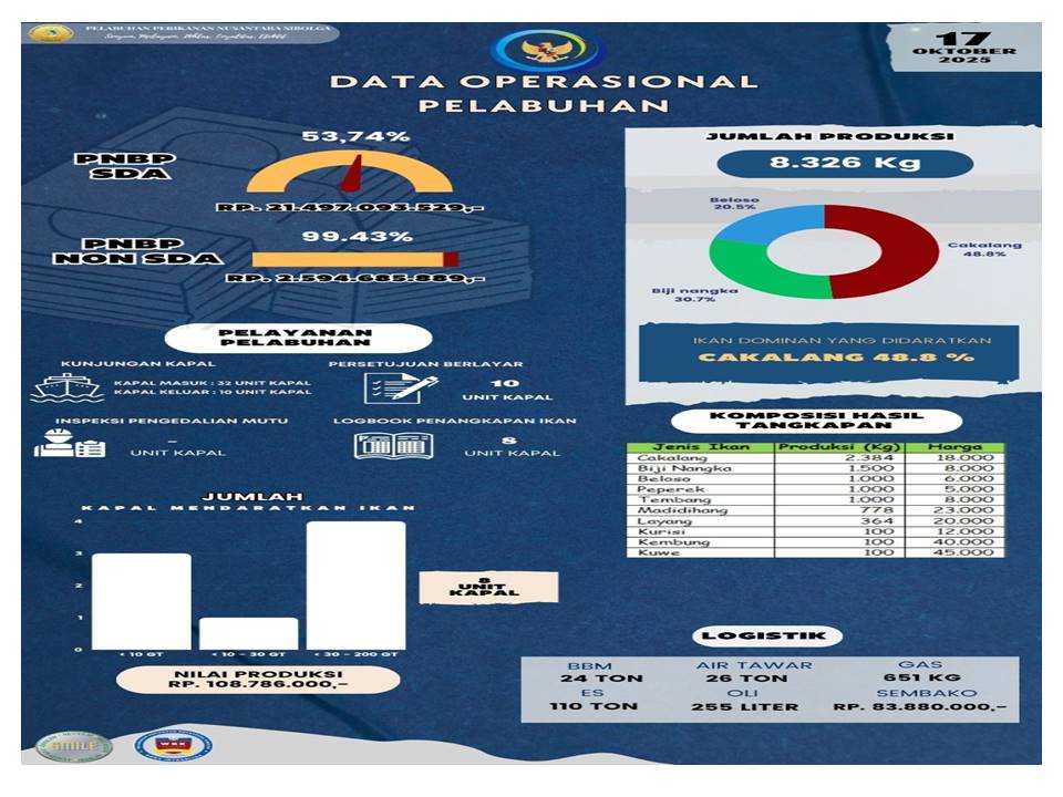 Sobat Bahari,,,Yuk kita simak Infografis Data Operasional Harian PPN Sibolga, 17 Oktober 2025 antara lain : Jumlah Unit Kapal, Jumlah Produksi, Nilai Produksi, PNBP SDA, PNBP Non SDA, Pelayanan Pelabuhan