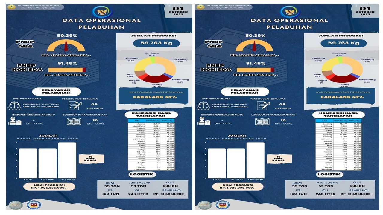 Sobat Bahari,,,Yuk kita simak Infografis Data Operasional Harian PPN Sibolga, 01 Otober 2025 antara lain : Jumlah Unit Kapal, Jumlah Produksi, Nilai Produksi, PNBP SDA, PNBP Non SDA, Pelayanan Pelabuhan