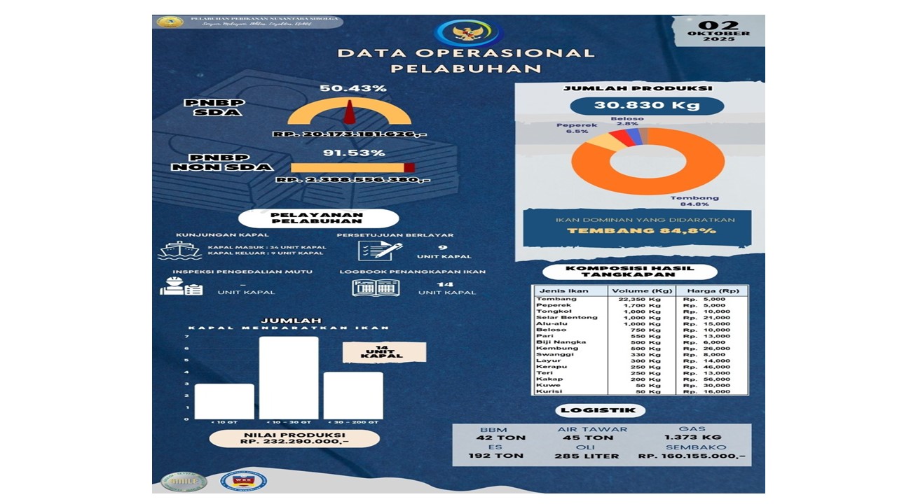 Sobat Bahari,,,Yuk kita simak Infografis Data Operasional Harian PPN Sibolga, 02 Otober 2025 antara lain : Jumlah Unit Kapal, Jumlah Produksi, Nilai Produksi, PNBP SDA, PNBP Non SDA, Pelayanan Pelabuhan