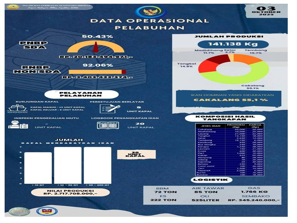 Sobat Bahari,,,Yuk kita simak Infografis Data Operasional Harian PPN Sibolga, 03 Otober 2025 antara lain : Jumlah Unit Kapal, Jumlah Produksi, Nilai Produksi, PNBP SDA, PNBP Non SDA, Pelayanan Pelabuhan