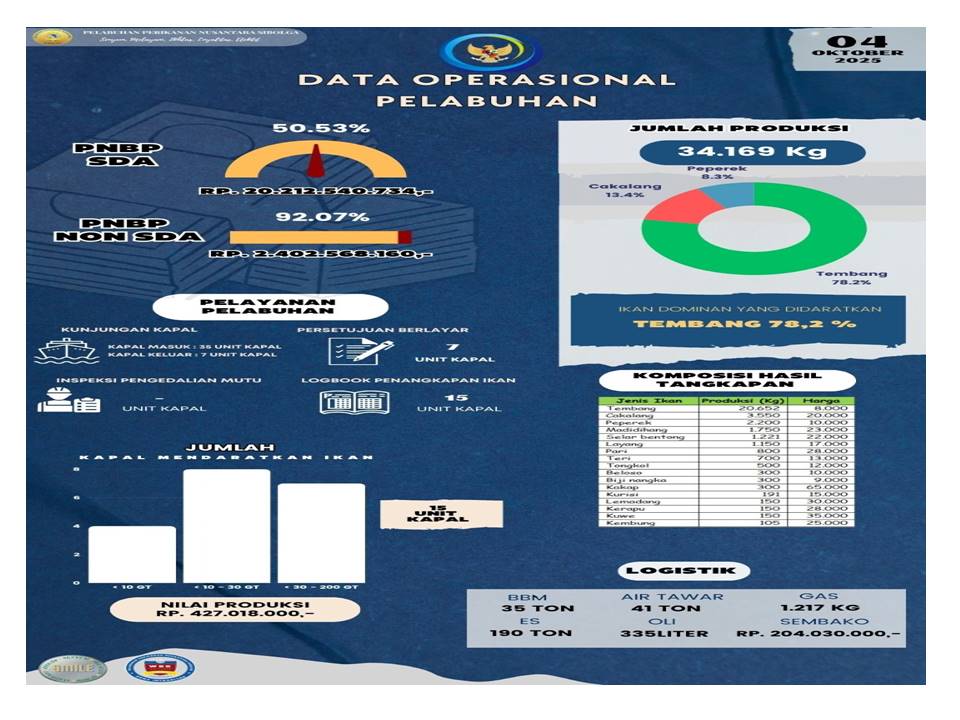 Sobat Bahari,,,Yuk kita simak Infografis Data Operasional Harian PPN Sibolga, 04 Otober 2025 antara lain : Jumlah Unit Kapal, Jumlah Produksi, Nilai Produksi, PNBP SDA, PNBP Non SDA, Pelayanan Pelabuhan