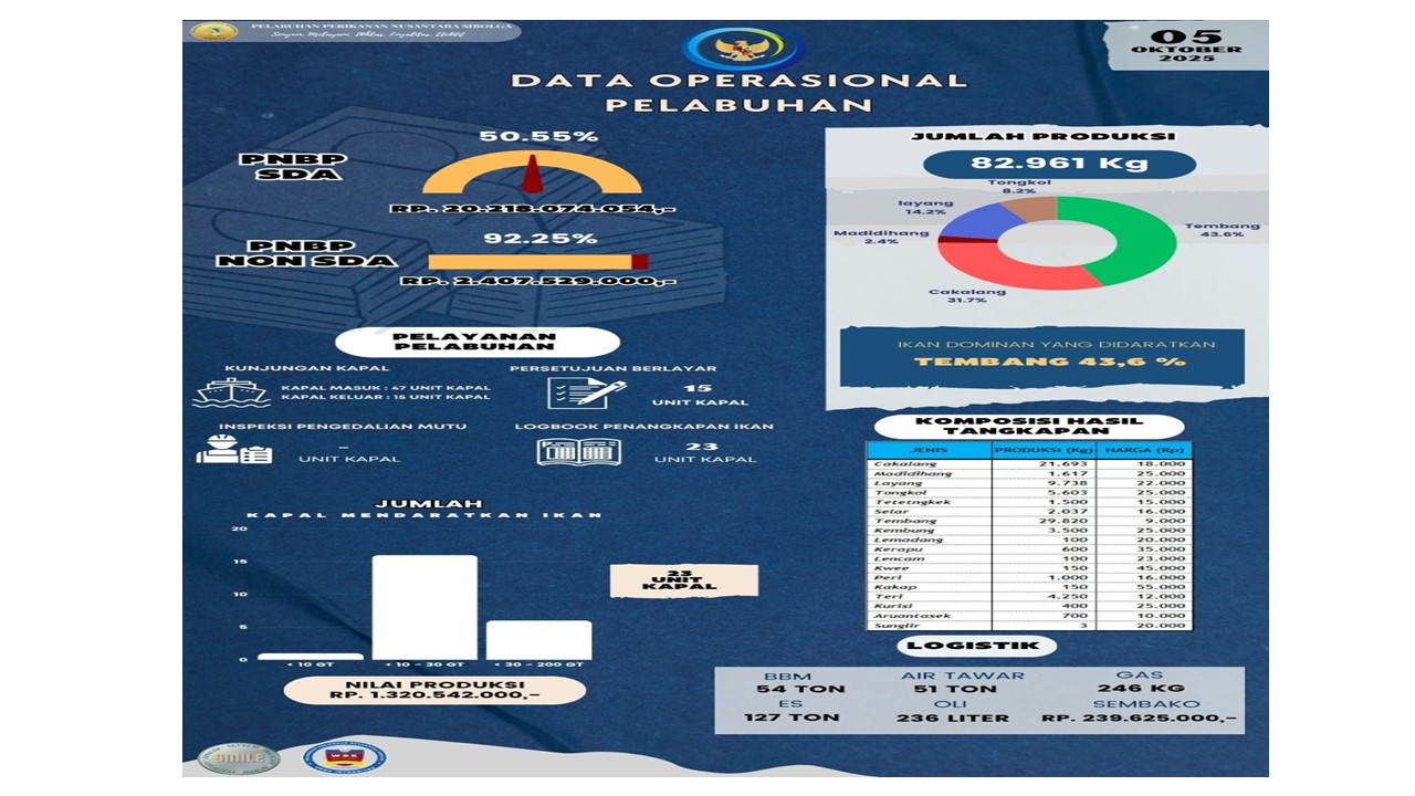 Sobat Bahari,,,Yuk kita simak Infografis Data Operasional Harian PPN Sibolga, 05 Oktober 2025 antara lain : Jumlah Unit Kapal, Jumlah Produksi, Nilai Produksi, PNBP SDA, PNBP Non SDA, Pelayanan Pelabuhan