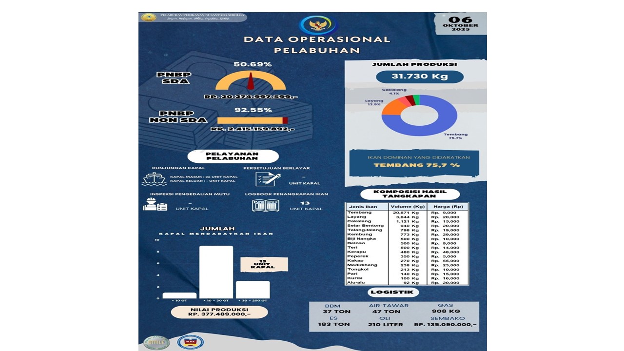 Sobat Bahari,,,Yuk kita simak Infografis Data Operasional Harian PPN Sibolga, 06 Oktober 2025 antara lain : Jumlah Unit Kapal, Jumlah Produksi, Nilai Produksi, PNBP SDA, PNBP Non SDA, Pelayanan Pelabuhan