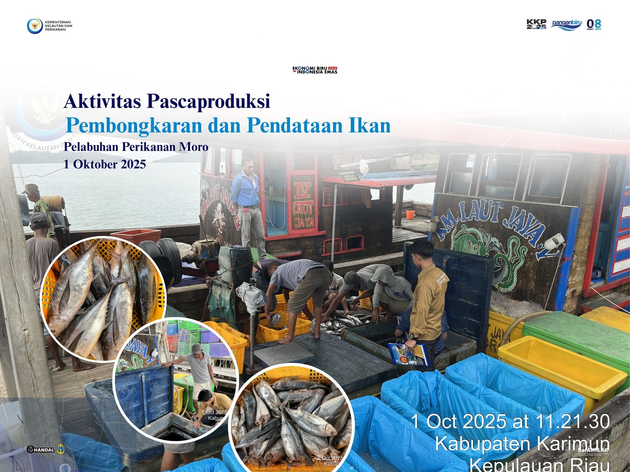 Rabu (1 Oktober 2025), Petugas PP. Moro melakukan aktivitas pembongkaran dan pendataan ikan Kapal Pasca Produksi dalam rangka mendukung program PIT pada kapal penangkap ikan dengan alat tangkap Jaring Insang Hanyut di Pelabuhan Perikanan Moro