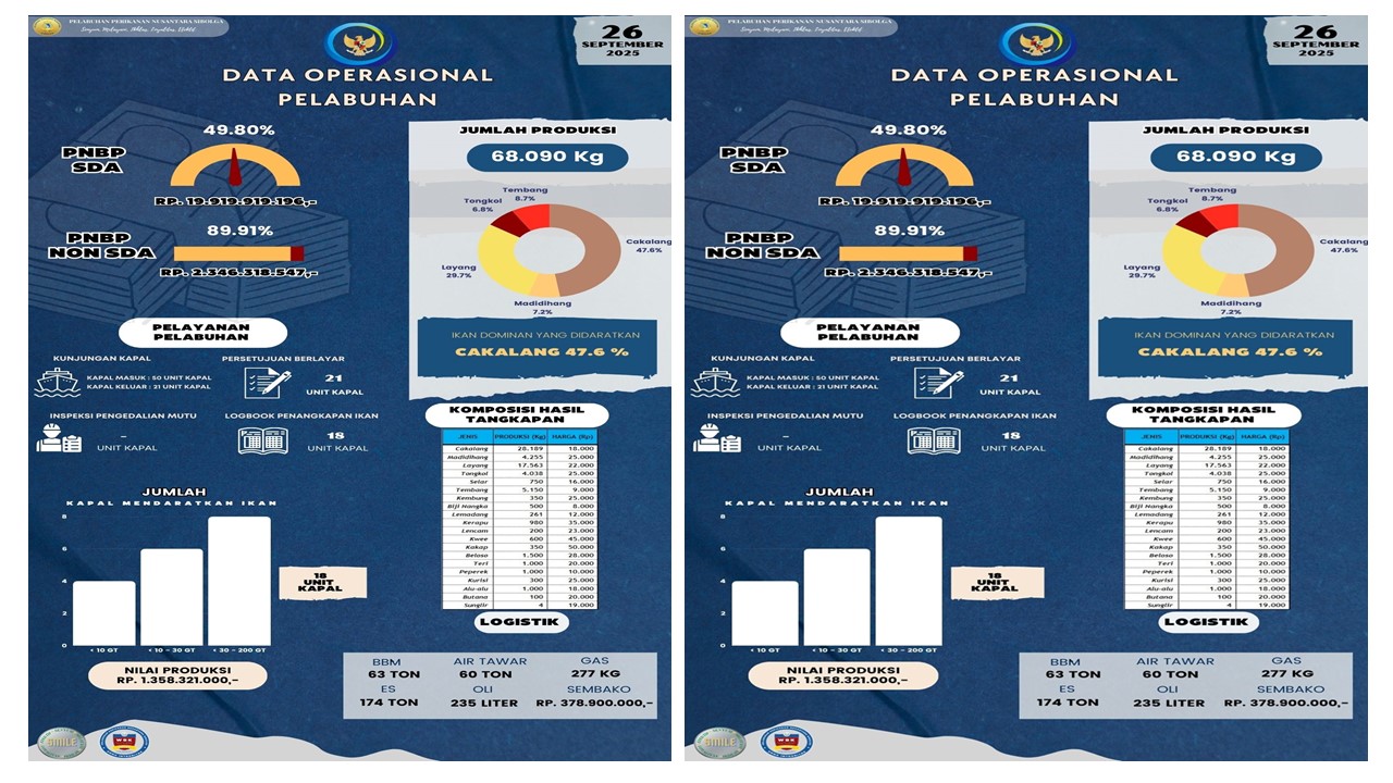 Sobat Bahari,,,Yuk kita simak Infografis Data Operasional Harian PPN Sibolga, 26 September 2025 antara lain : Jumlah Unit Kapal, Jumlah Produksi, Nilai Produksi, PNBP SDA, PNBP Non SDA, Pelayanan Pelabuhan;