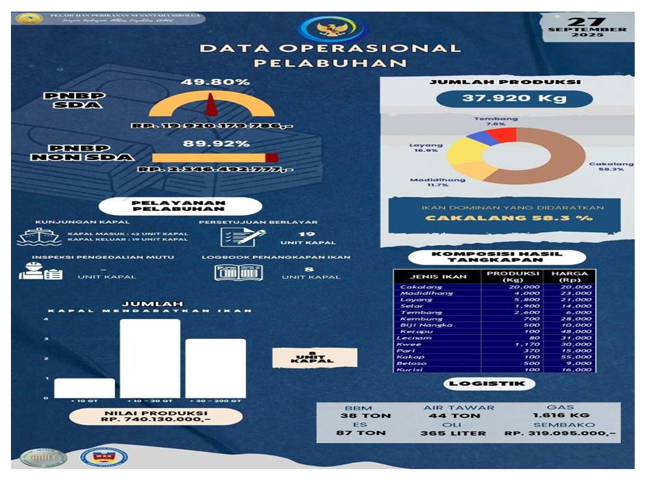 Sobat Bahari,,,Yuk kita simak Infografis Data Operasional Harian PPN Sibolga, 27 September 2025 antara lain : Jumlah Unit Kapal, Jumlah Produksi, Nilai Produksi, PNBP SDA, PNBP Non SDA, Pelayanan Pelabuhan