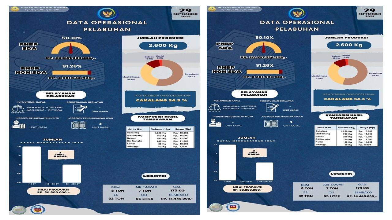 Sobat Bahari,,,Yuk kita simak Infografis Data Operasional Harian PPN Sibolga, 29 September 2025 antara lain : Jumlah Unit Kapal, Jumlah Produksi, Nilai Produksi, PNBP SDA, PNBP Non SDA, Pelayanan Pelabuhan