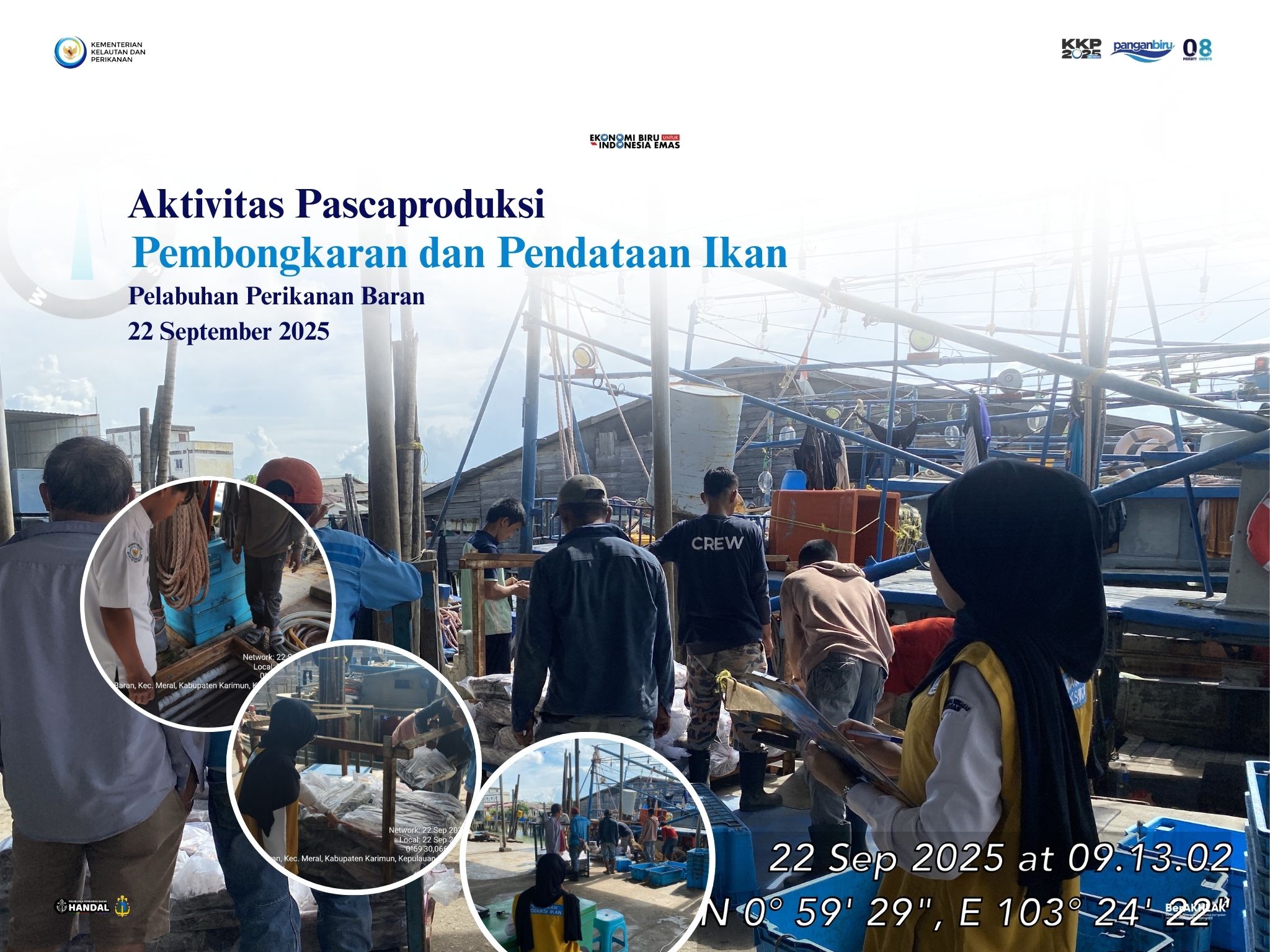 Senin (22 September 2025) Petugas PP. Baran melakukan aktivitas pembongkaran dan pendataan ikan Kapal Pasca Produksi dalam rangka mendukung program PIT pada kapal penangkap ikan dengan alat tangkap Jala Jatuh Berkapal.