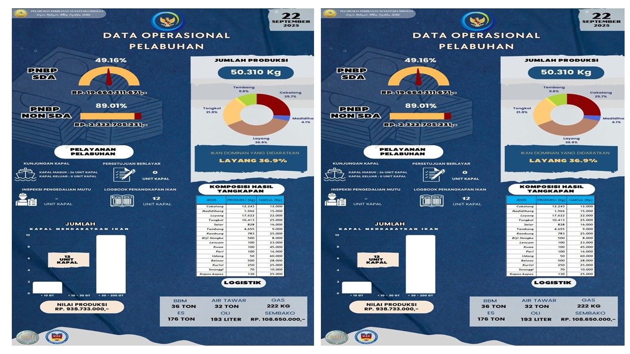 Sobat Bahari,,,Yuk kita simak Infografis Data Operasional Harian PPN Sibolga, 22 September 2025 antara lain : Jumlah Unit Kapal, Jumlah Produksi, Nilai Produksi, PNBP SDA, PNBP Non SDA, Pelayanan Pelabuhan;