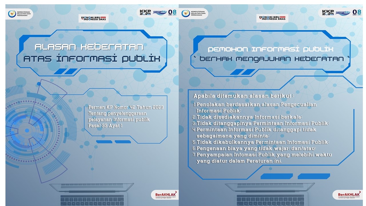 Sesuai dengan Peraturan Menteri Kelautan dan Perikanan Republik Indonesia nomor 42 tahun 2023 tentang penyelenggaraan layanan informasi publik di lingkungan Kementerian Kelautan dan Perikanan, pemohon berhak untuk mengajukan keberatan atas informasi. ...