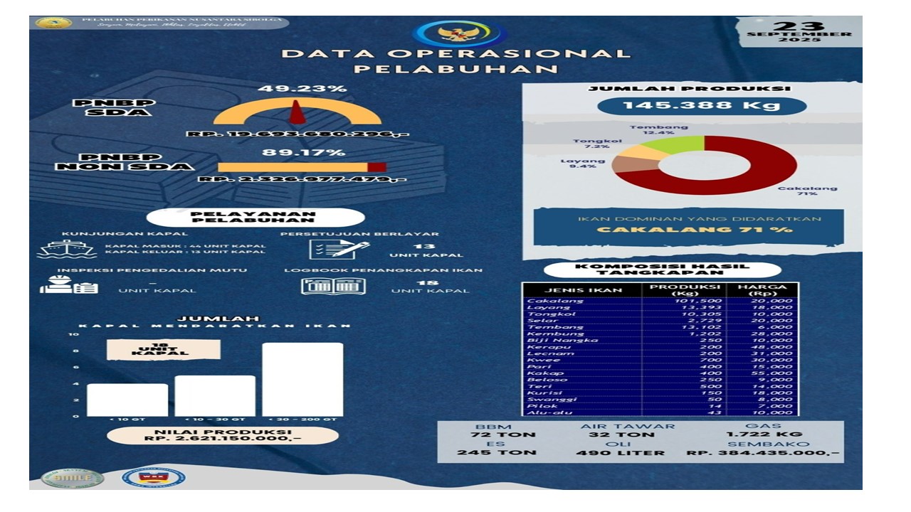 Sobat Bahari,,,Yuk kita simak Infografis Data Operasional Harian PPN Sibolga, 23 September 2025 antara lain : Jumlah Unit Kapal, Jumlah Produksi, Nilai Produksi, PNBP SDA, PNBP Non SDA, Pelayanan Pelabuhan;