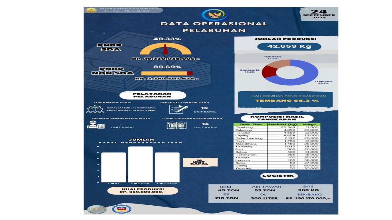 Sobat Bahari,,,Yuk kita simak Infografis Data Operasional Harian PPN Sibolga, 24 September 2025 antara lain : Jumlah Unit Kapal, Jumlah Produksi, Nilai Produksi, PNBP SDA, PNBP Non SDA, Pelayanan Pelabuhan;