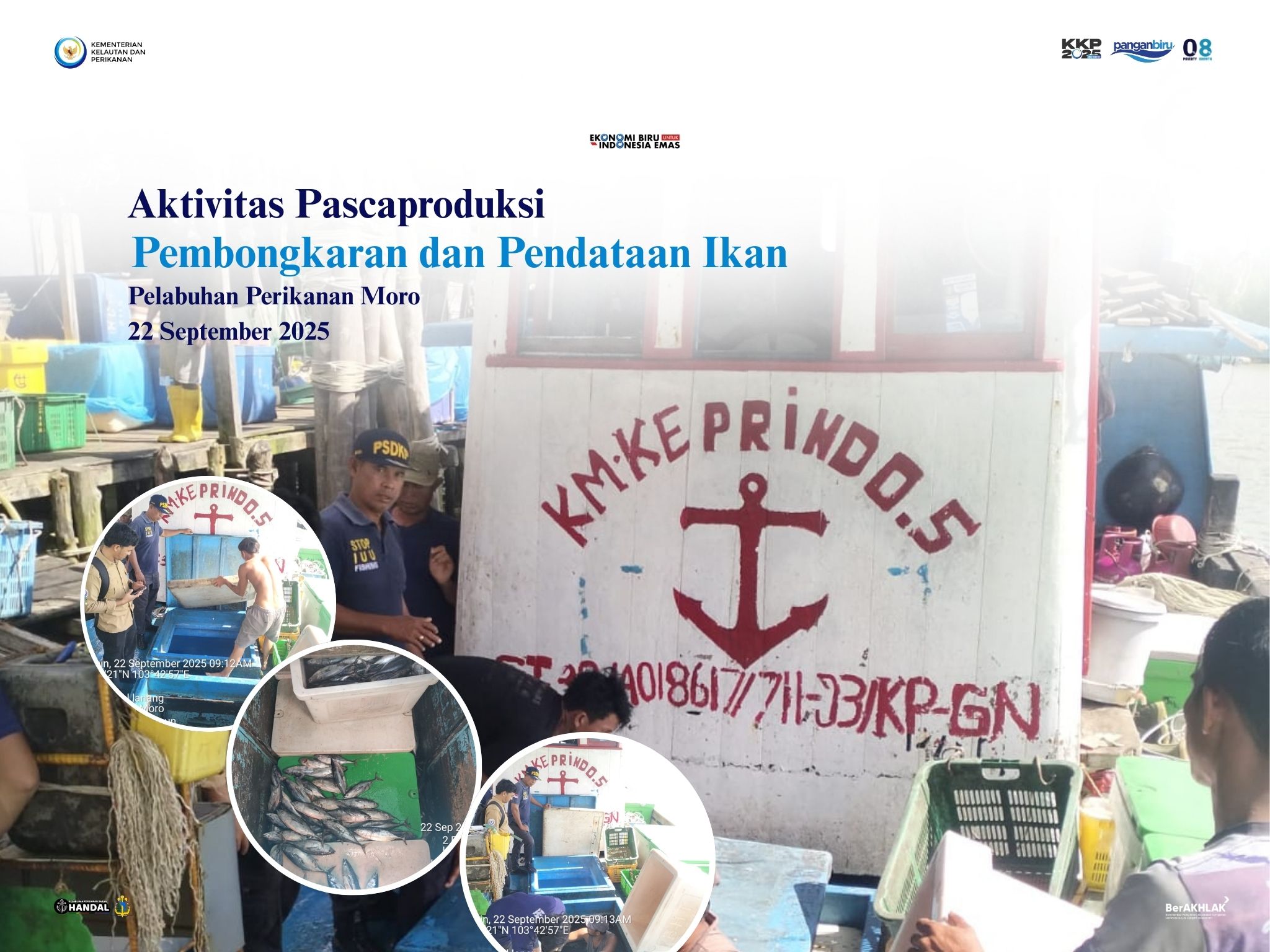 Senin (22 September 2025), Petugas PP. Moro melakukan aktivitas pembongkaran dan pendataan ikan Kapal Pasca Produksi dalam rangka mendukung program PIT pada kapal penangkap ikan dengan alat tangkap Jaring Insang Hanyut di Pelabuhan Perikanan Moro